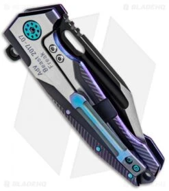 This Custom Beast “Freak” model has a purple titanium handle with a green C-Tek insert and a modified tanto blade with a black Hamon finish. The Beast folder from Andre de Villiers is a beefy, solid built titanium frame lock knife with attitude. It’s more than just a large knife, it offers an optimal shape that caters to in-hand comfort and control. The titanium backspacer lends a hole for lanyard attachment and the milled pocket clip is a solid touch to this outstanding knife.