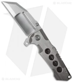 Hard to come by, but the Invader is a decidedly phenomenal flipper design. This mid-tech model has a two-tone finished titanium handle with framelock and raised, bead blasted pocket clip. It has a compound ground blade with a high satin finish. Action is smooth and lockup is crisp.