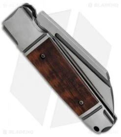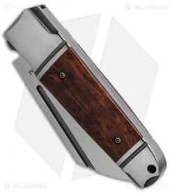 The Pocket Butcher features a D2 tool steel blade with a satin finish and a bead blasted finger groove along the length of the blade for easy opening. Its handle sports a classic stainless steel bolstered design with rosewood inlays and a lanyard hole. Includes a padded velcro pouch.