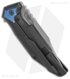 - Stonewashed gray clip point blade made from Bohler M390 steel.