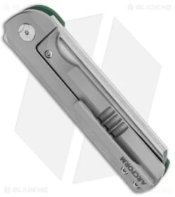 - Green G-10 handle scale with a blasted titanium backspacer and frame.