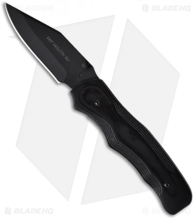 Bear OPS (a division of Bear & Son Cutlery) has created a new line of folding knives. This MC-110 series knife has a modified clip point style CPM-S30V steel blade with a plain edge and black finish. It also has 4-3/8″ polished black G10 scales over a steel liner lock frame. The G10 has stepped contours. The tip-down pocket clip is bead blast finished to match the blade and frame. The action and over all quality is quite good.