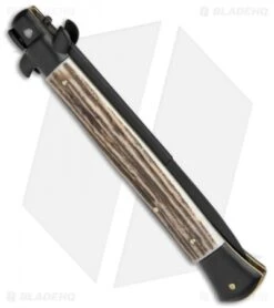 This 11″ Italian Stiletto from Frank B. features classic stiletto style with a stag handle and a black finished bayonet blade. Frank B creates some of the finest authentic Italian stilettos available on the market today. This 11″ model has a stag handle with stainless steel bolsters. Brass pins and liners add a classic touch to the design. The blade comes in a bayonet style with a plain edge and a black finish. Add the premier Italian knife-maker to your collection today with an authentic Italian stiletto from Frank B.
