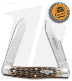 This Bull Moose pocket knife features a classic 2 blade design and an antique amber jigged bone handle. The GEC Northfield UN-X-LD Bull Moose pocket knife includes a large clip point blade and a spear point blade. Nickel silver bolsters and brass liners add a classic flair to the design. Brass pins and a nickel silver inlay finish of the impressive Bull Moose design from GEC Northfield UN-X-LD.