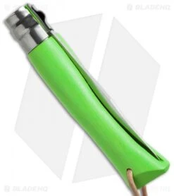 This Opinel #7 Trekking folder has a stainless steel clip point blade and green beech wood handle with a leather lace lanyard. Includes the Virobloc safety ring that locks the blade in the open and closed positions. This traditional Opinel pocket knife is lightweight and inexpensive while displaying simple sophistication.