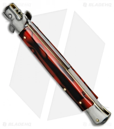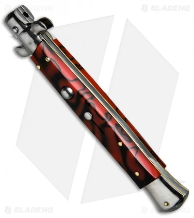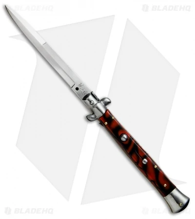 This 11″ Italian Stiletto from SKM Italy offers classic stiletto style with a red swirl handle and a bayonet blade. SKM worked with famed knife-maker Armando Beltrame to bring you traditional stiletto designs at an affordable price. This 11″ model has an acrylic handle with stainless steel bolsters. Brass pins and liners add a classic finishing touch to the piece. The bayonet blade has a plain edge and a satin finish. Experience the affordable Italian quality of these authentic stilettos from SKM Italy.