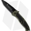 - 4034 stainless steel, drop point blade with black finish, partially serrated edge, and thumb stud opener.